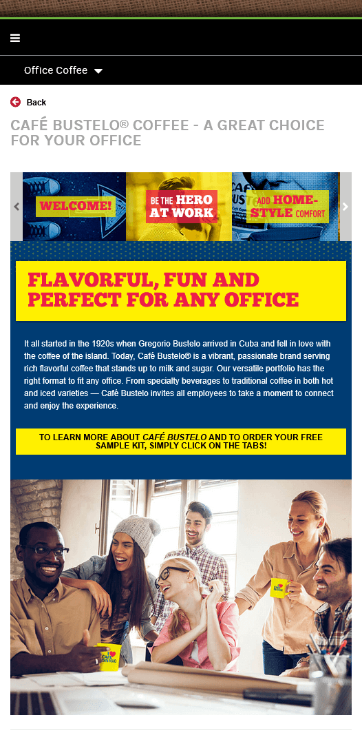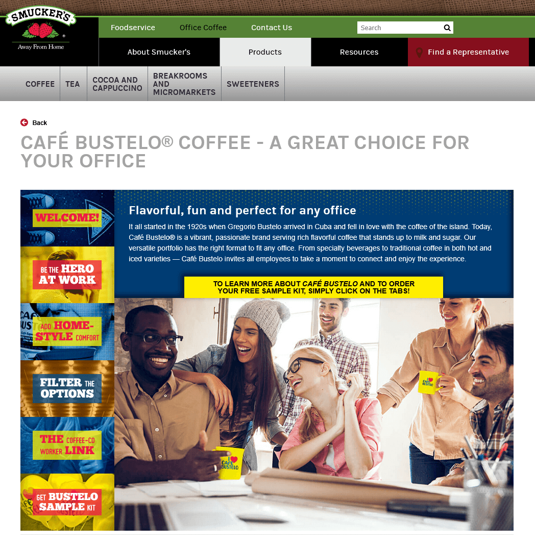 I worked on several landing pages for Smucker's including Cafe Busttelo Office Coffee Campaign (Internet Archive link)